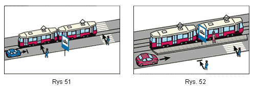 jeżeli przystanek nie jest wyposażony w wysepkę dla pasażerów, a na przystanek wjeżdża tramwaj lub stoi na nim, kierujący jest obowiązany zatrzymać pojazd w takim miejscu i na taki czas, aby zapewnić pieszemu swobodne dojście do tramwaju lub na chodnik (rys. 51),
