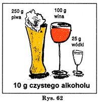 Oznacza to, że gdy wypite zostanie małe piwo (250 g), lampka wina (100 g) czy mały kieliszek wódki (25 g), to za każdym razem organizm człowieka wchłonie tę samą ilość czystego alkoholu równą ok. 10 g alkoholu etylowego. |