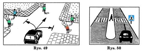 Kierujący pojazdem, który skręca w drogę poprzeczną, jest obowiązany ustąpić pierwszeństwa pieszemu przechodzącemu na skrzyżowaniu przez jezdnię, na którą wjeżdża (rys. 49).
