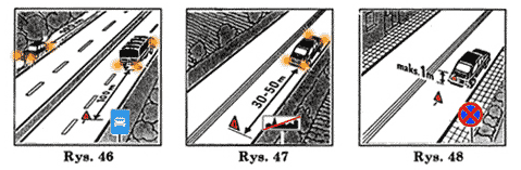- umieszczenie ostrzegawczego trójkąta odblaskowego w odległości 100 m za pojazdem; trójkąt ten umieszcza się na jezdni lub poboczu, odpowiednio do miejsca unieruchomienia pojazdu (rys. 46).